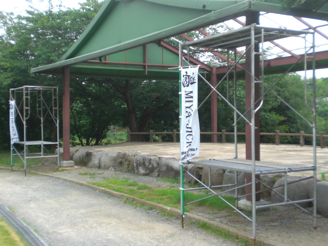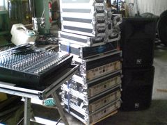 × [PR]上記の広告は3ヶ月以上新規記事投稿のないブログに表示されています。新しい記事を書く事で広告が消えます。 日にちが経つのも早いもので ミヤジック開催まで 2週間を切ってしまいました 気持ち的にはちょっと焦り気味でございます 今年の広報 印刷関係でつまずきまして 十分なポスター効果 チラシ効果が出来てるだろうか? この際残ったポスターをかき集めて 違法広告を行おうか? そんな事を考えてしまう今日この頃です 実はまだ 配布用チラシも完成しておりません 例年通りの 回覧板に添える事も今年は断念 新聞の折込もたぶん間に合いそうにない状態 例年ですと 今頃の時期 問い合わせ電話がかなり入っておりましたが 今年は全く電話もならず・・・・・・・・・・ 心配事は耐えませんね それでも 会場の準備は進めなくてはいけません 本日より 仕込みの1便目に行ってまいりました まずはスピーカーイントレの搬入 結構これだけでもかなりな重量物で 軽トラックにも 一杯になってしまいます 一度に全ての物量を持ち込みまして 一斉に作業をやるには 人出も必要になってしまいます 忙しい中 皆さんの手を借りて順調に作業を進めるよう 事前に段取りと人員配置など めんどくさいのが苦手な ワタシ 事前に少しづつ 一人で作業するのが 一番気楽でございます 去年製作しました スピーカーサイズに合わせた イントレ 今年も活躍いたします まだ ステージ上の屋根工事も行われてない状態ですが 9日までには 屋根工事も完了する予定でございます まずは一段目 レベルと角度を微調整しながら 組み立てまして 土台を作ります これが出来れば 後は早いものです 上に延長を組みつけまして チョチョッと完成 作業中 かなり沢山の人が神社内を徘徊しておりまして 皆さん 何があったんですか? と尋ねられました 完全に片付け作業をしているものと思われておりました 誰ひとり 何があるんですか? という言葉を聞くことは ございませんでした ちょっと寂しい気持ちになりましたね そして 最後に ミヤジックののぼり旗を括りつけまして 今日の作業は終了です 次の日曜10日から 本格作業に入ります その後は毎日 現場になんやかんや運び込む事となるでしょう ちなみに まだセミは鳴いてませんでした PR 去年は諸事情にて フリマの開催は見送りしました 今年のミヤジックはフリマもございます ![]() 只今出店される方大募集中でございます 受付は ミヤジックホームページ トップの エントリーフォームにて受付をしております http:// ![]() ![]() ■イベント開催日及び出店時間 平成23年7月16日(土)~18日(月・祝) 福津市 宮地嶽神社芝生広場(雨天決行) 16日(土) 16:00受付開始 出店 17:00~20:00 *合掌造りエリアは開催なし。 17日(日) 8:30受付開始 出店 10:00~18:00 18日(月・祝) 8:30受付開始 出店 10:00~18:00 * 搬入・出店時間は各店舗により異なりますので別途ご連絡致します。 ■出店要項 ・ 出店料は1ブース(2.5×2.5m),一日500円となります。 ・ お一人様2ブースまでお申し込みできます。 ・ 搬入時刻は午前8時より宮地嶽神社第一駐車場にて受付終了後にお願い致します。 ・ 飲食店以外の出店者車両は会場内に乗り入れることは出来ません。係員の指示に従い 入口の一時停車スペースに駐車の上、順次搬入後、車両はすみやかに駐車場へ移動して下さい。 原則として終了時間前の搬出は出来ませんがやむを得ず搬出される場合は必ず係員にご一報下さい。 先週のイベントで 出音がどうもおかしい アンプが一台あることを発見 通常の音量では解りにくい程ですが 大音量を出したときに明らかに LチャンネルとRチャンネルの音が違います そのときは予備アンプがありましたので その場は凌ぎました で本日改めて確認 8オーム500ワット出力のアンプが3台 それぞれパラレル接続して 実際に音を出して 確認です CDなどの音楽物でチェックするとウルサイだけですので 今回は ホワイトノイズでチェックしました テスターで出力DCを計れば簡単に解るのですが 音質まではテスターでは解りません ここは 耳で勝負です 結果 やはり 3台中1台 片チャンネル出力落ち・・・・・・ どうもHI落ちしているようで 出力が落ちているように 聞こえます しばらくは大出力アンプが必要な仕事はございません その間に修理ですね 過去一度も体験した事無い程の猛暑続きのワタシ的には3日間 とにかく大きな事故も無く 熱中症で救急車が出動する事も 無く 盛大に終了いたしました 来場されました皆様 参加された皆様 本当にありがとうございました 年々来場されるお客様も増えて参りまして 少しづつ進歩しているミヤジックでございます 今年は 2日間で2000人程の来場者があったようです アマチュアバンドのライブイベントでは 動員に限界があることは承知しております それでも 来ていただいてあるお客様には 十分楽しめる内容で・・・・・・・・・・ と あれこれ毎年工夫を凝らしておりますが まだまだ 途上状態でございます 今年は例年ポスターの挿絵を書